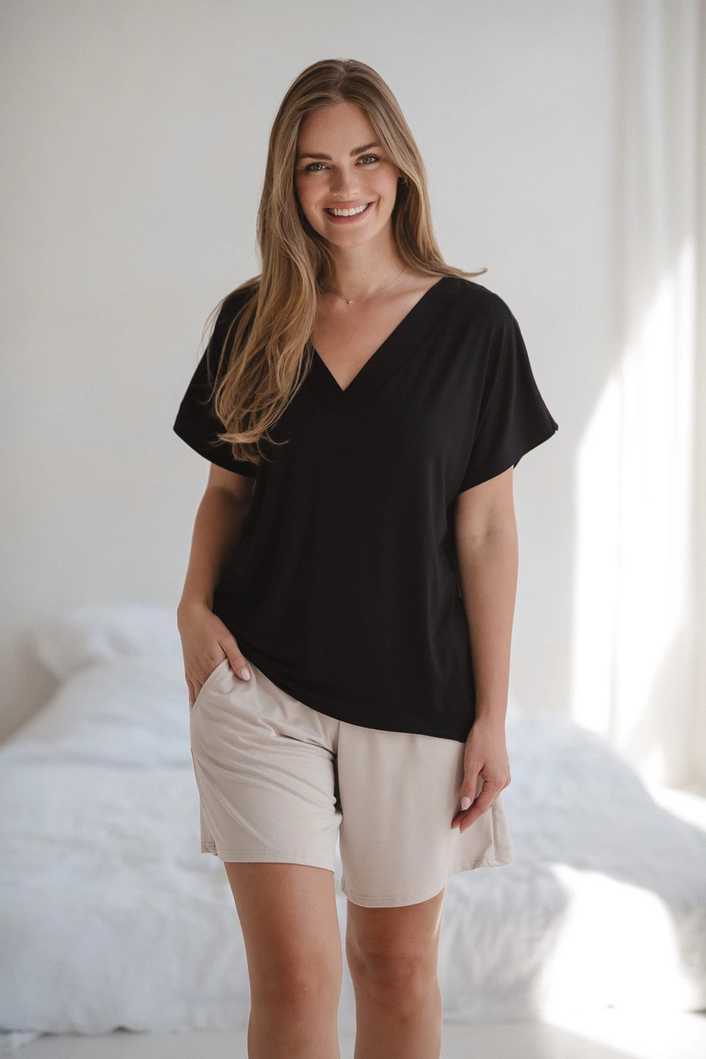 Odkryj krótkie spodnie od piżamy ciążowej Moon – idealne połączenie wygody, funkcjonalności i kobiecego stylu. Ta piżama ciążowa i do karmienia została stworzona z myślą o komforcie mam w ciąży i po porodzie. Sama wybierasz swój wymarzony zestaw: kolor, długość nogawek oraz rękawów – bo każda mama zasługuje na dopasowaną piżamę.
