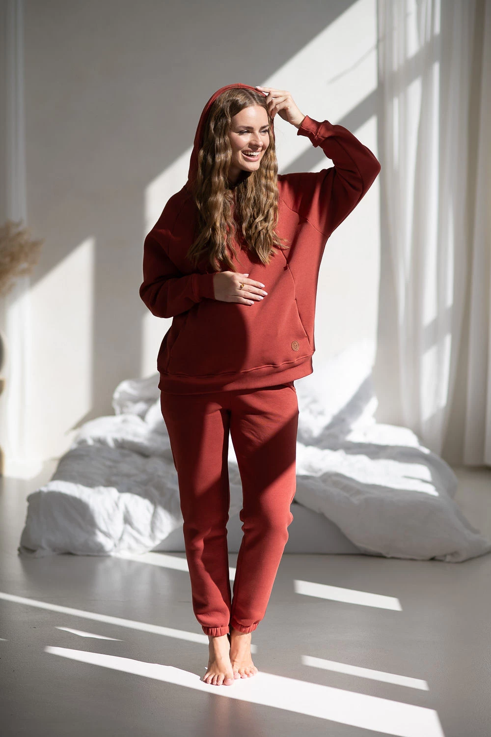 Model oversize z łatwością pomieści rosnący brzuszek ciążowy, a po porodzie wróci do swojego pierwotnego kształtu. Całość dopełnia modny, ciepły odcień chili oil, który doda energii każdej stylizacji.