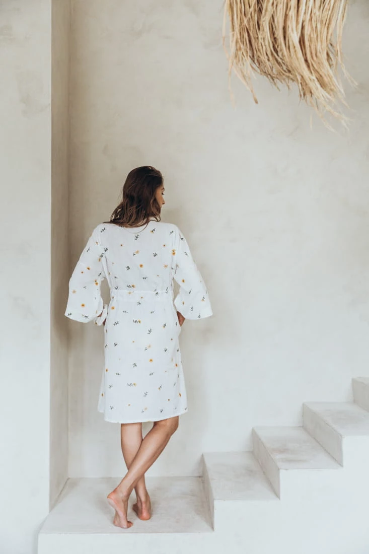 To szlafrok na co dzień – na poranki, wieczory i długie dni regeneracji. W chwilach zmęczenia i bliskości z dzieckiem, delikatny muślin i kwiatowe detale będą przywoływać najpiękniejsze wspomnienia.