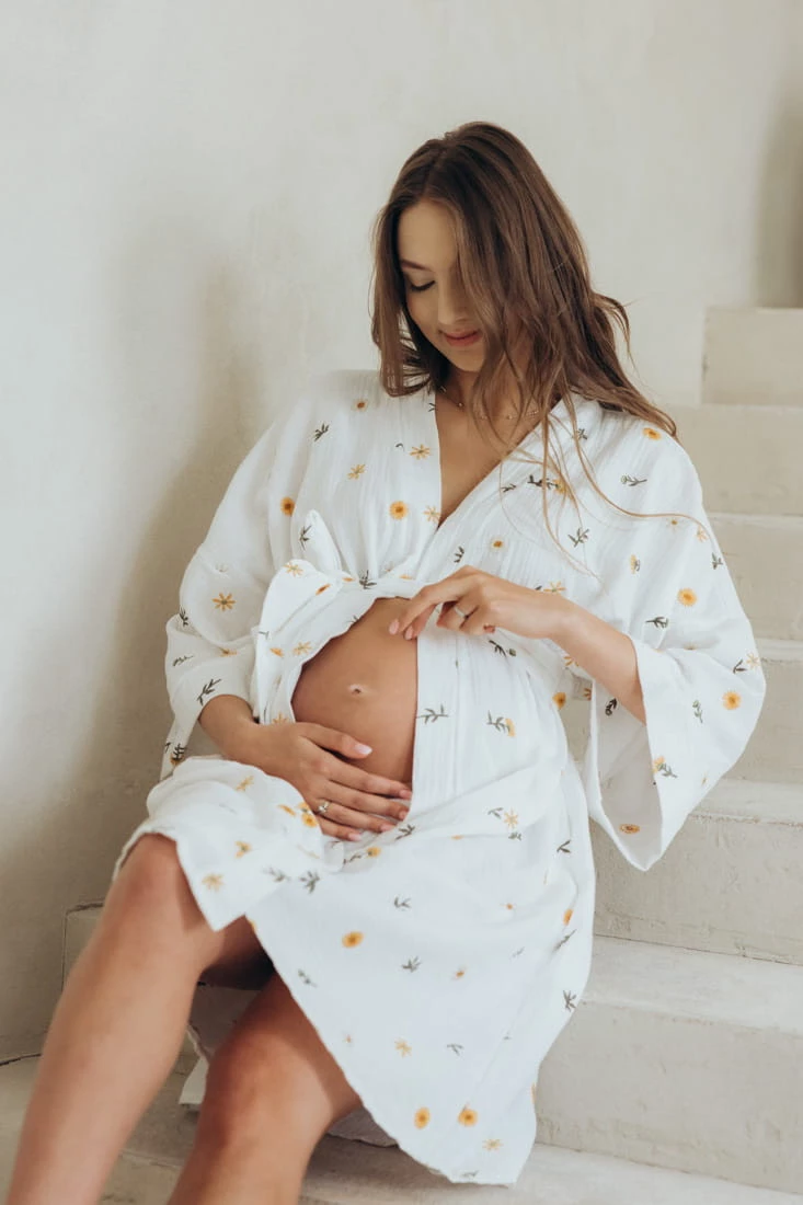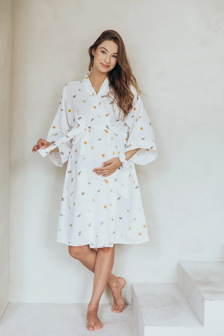 Szlafrok ciążowy muślinowy HERBAL LATTE biały – kimono dla przyszłej mamy